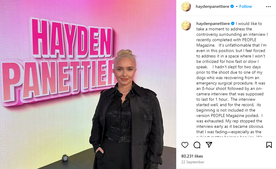 Actress Hayden Panettiere has recently addressed the backlash she faced following an interview with People magazine. In a heartfelt Instagram post on September 22nd, Panettiere expressed her thoughts on the matter and defended herself against criticism.