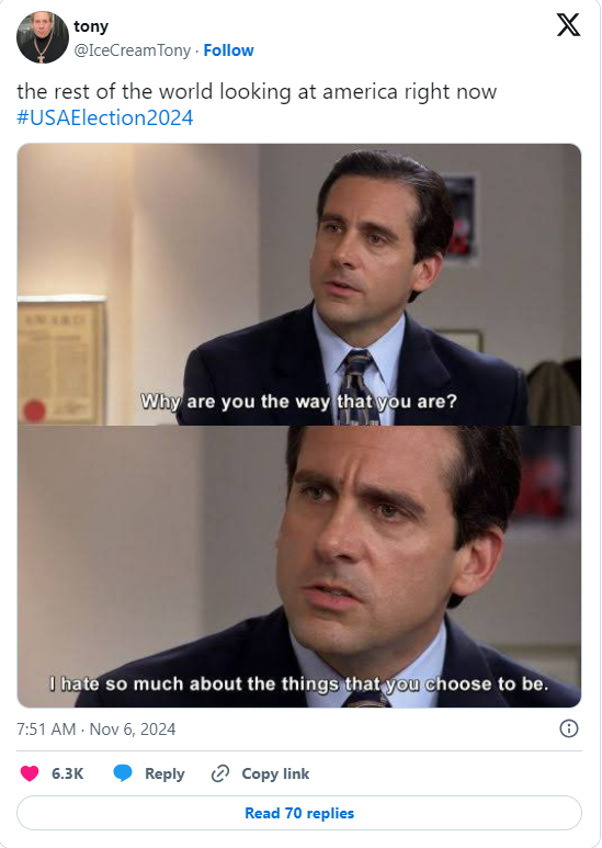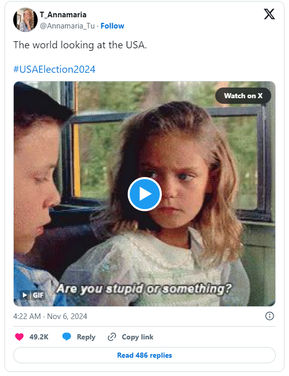 “As a British person, how are Americans struggling between picking a well-educated woman or a convicted felon who’s going to make everyone’s lives awful,” concurs another.