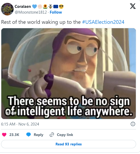 Another social media user concludes: “Non-Americans are watching the US struggle to choose between electing a professional career politician or a racist serial s*x offender with 34 felony charges and the IQ of a spoon.”