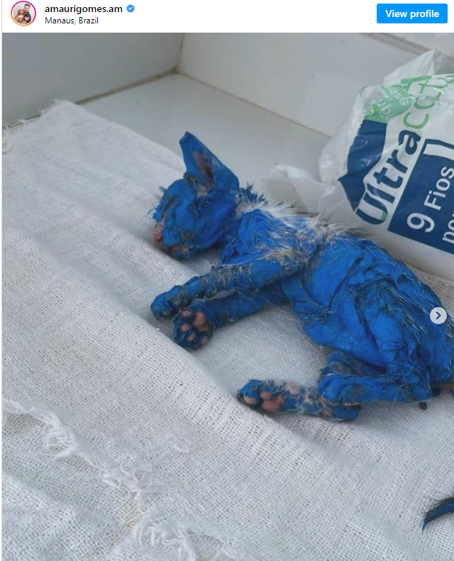 Animal rescuer Amauri Gomes found the cat and took her to the vet. They began the time-consuming process of carefully removing the blue paint off of her using pet-safe cleansers and oils.
