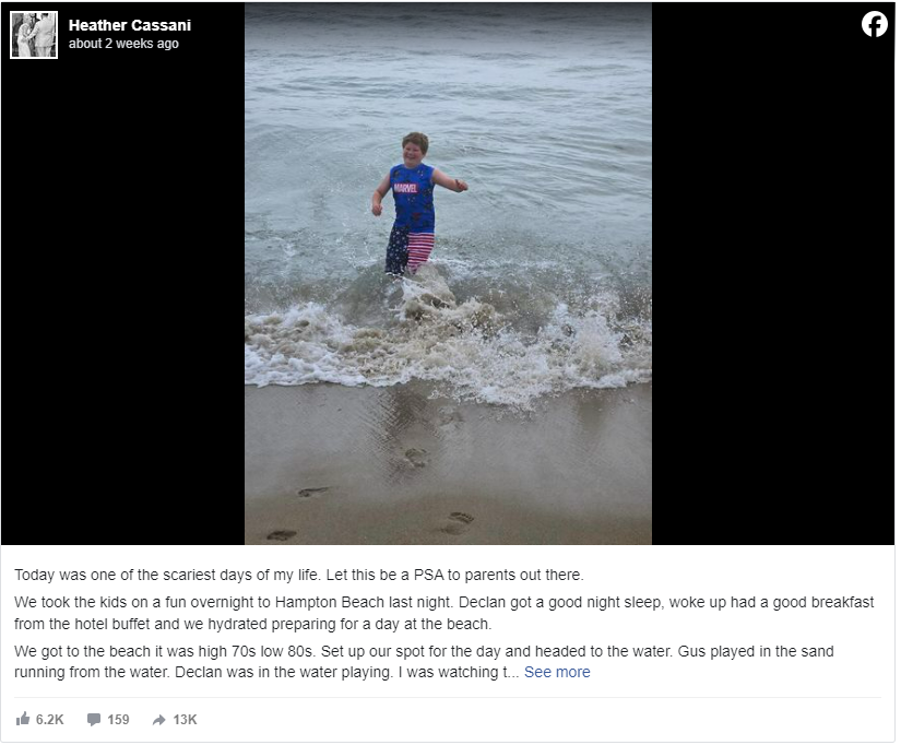 “I thought the breakfast was just too much for the waves and he just needed to lay down,” Cassini wrote on a now viral Facebook post. As soon as they started to head back so Declan could lay down, he became “disoriented” and collapsed on a sunbather.