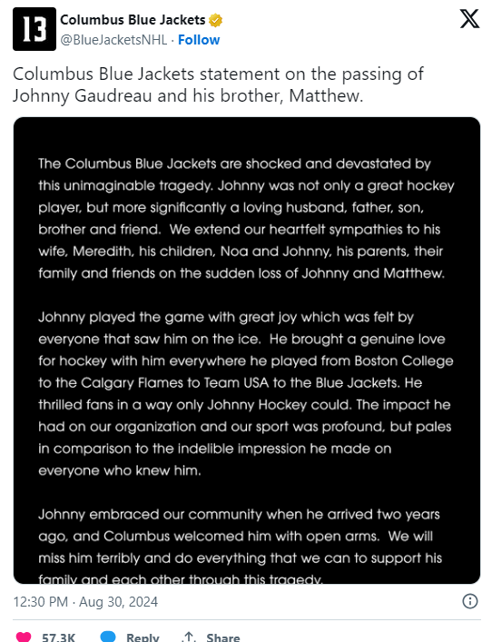 Johnny’s hockey team, the Columbus Blue Jackets, posted a statement about his demise on X earlier today, August 30. The lengthy message notes how devastated and shocked the team is by the sad news.