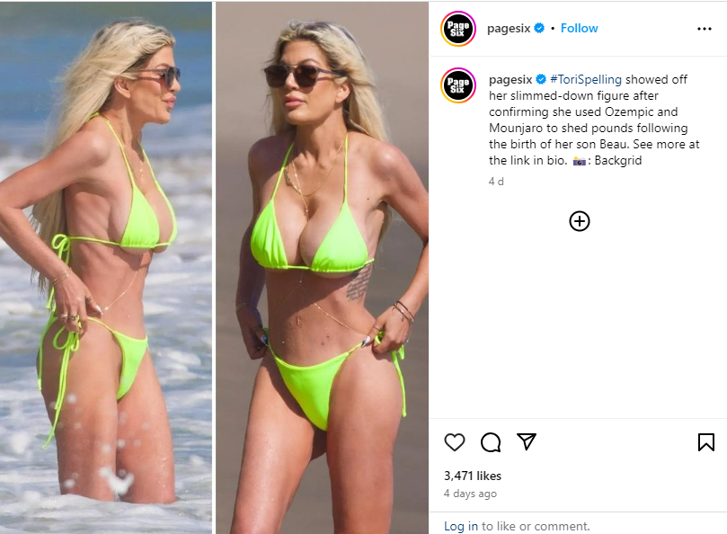 As put by Page Six who shared images of Tori at the beach, “#ToriSpelling showed off her slimmed-down figure after confirming she used Ozempic and Mounjaro to shed pounds following the birth of her son Beau.”