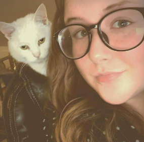 A woman is sitting in a leather chair with a cat sneaking into the frame. At first, the cat might seem like part of her clothing, but a closer look reveals its playful photobombing presence.