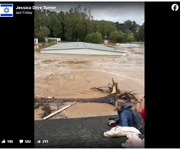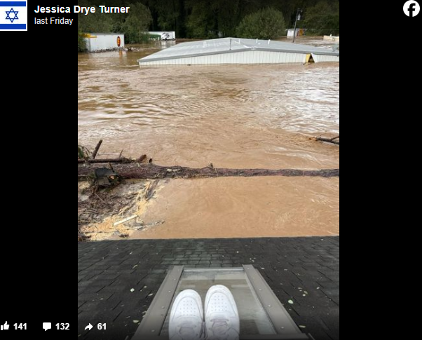 Turner initially asked friends and family for prayers for her sister, nephew, and parents who were stuck on the roof of their house in Asheville, North Carolina. She detailed how her family sat trapped with only the clothes on their backs and one working phone, while they waited to be rescued.